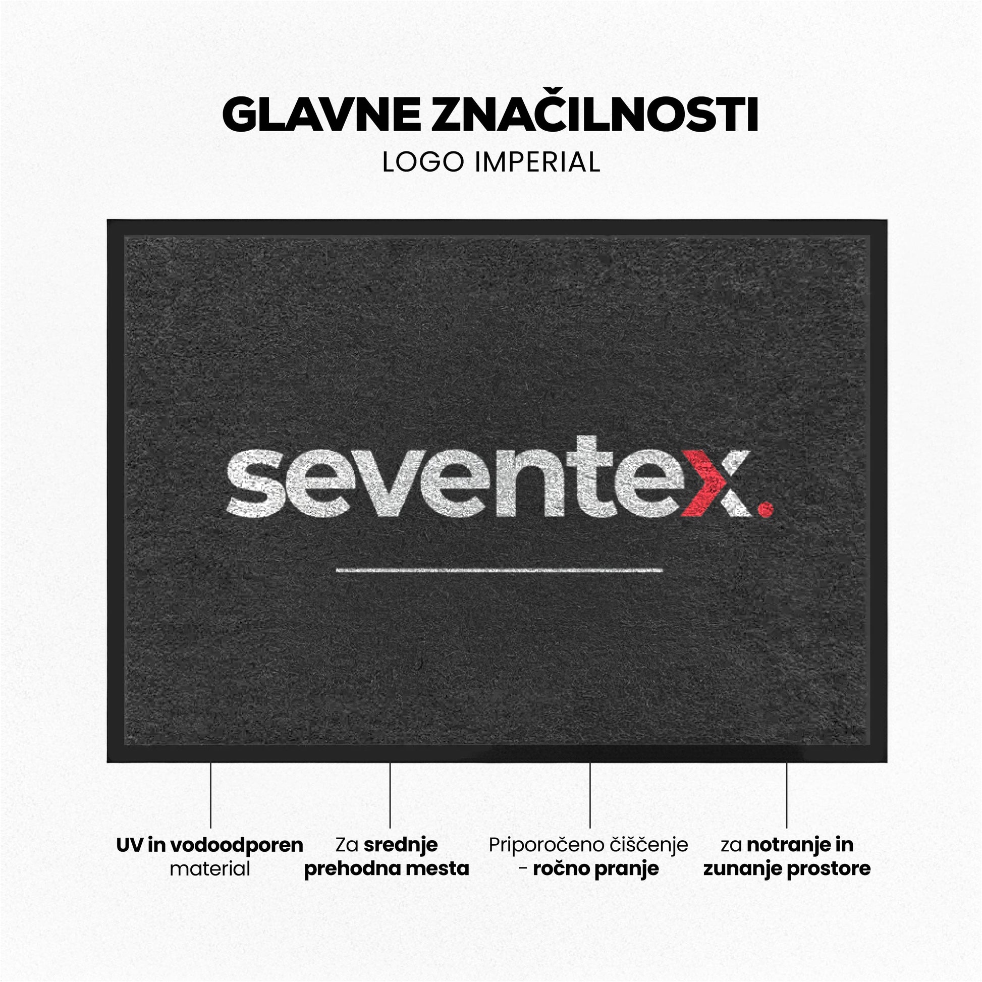 Seventex Logo Imperial je večnamenski predpražnik namenjen uporabi na srednje obremenjenih prostorih. Gre za predpražnik, ki se ga lahko pogojno koristi tudi za uporabo na zunanjih mestih. S pomočjo Brilliant Step barvnega tiska lahko dosežemo skoraj neskončne barvne kombinacije. Najlonska tkanina zagotavlja izjemno globino barve in površino brez vidnih lis, kar povečuje vzdržljivost ter učinkoviteje skrije umazanijo in sledi stopal.